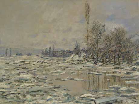 Les meules, la cathédrale de Rouen, les peupliers, le Parlement anglais… les séries de Monet –présentées pour partie dans cette exposition- sont célèbres, et la première d’entre elle, celles des "Débâcles des glaces", est une représentation de la Seine, en partie gelée, près de Vétheuil (à partir 1880). Selon diverses sources, ce ne fut pas